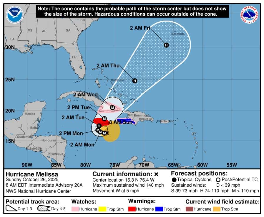 El huracán Melissa podría tocar tierra en Jamaica el lunes por la noche o el martes por la mañana como un potente ciclón de categoría 4, por lo que se prevén intensas lluvias, marejadas e inundaciones.