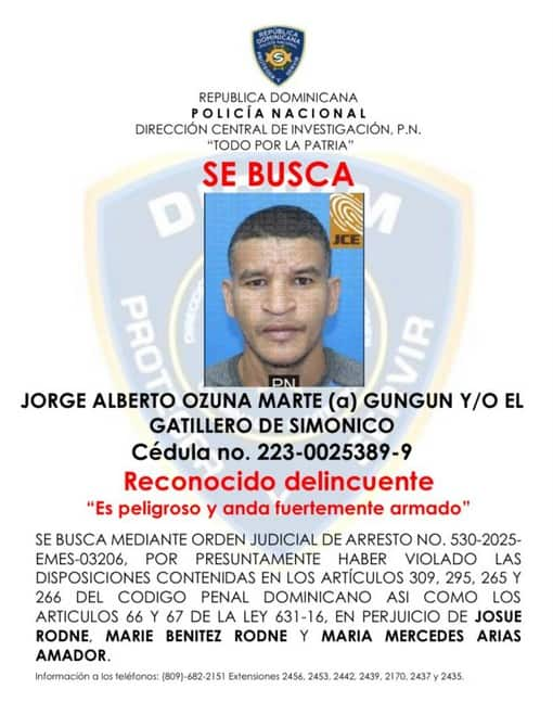 En tanto, la Policía señaló como prófugos y presuntos responsables directos del ataque a Jorge Alberto Ozuna Marte, alias «Gungún»; Gabriel Pérez Gómez, alias «Gaby»; y Albert Ricardo Peña Féliz, alias «La Pipa», quienes son activamente buscados.