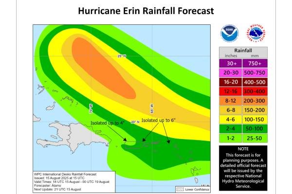 Los efectos indirectos de Erin, que se convirtió este viernes en el primer huracán de la temporada atlántica, provocarán lluvias…