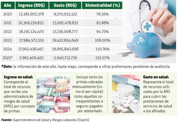 Hasta mayo de 2025, el dato que es preliminar en espera de auditoría, indica que la siniestralidad ha superado el 130%, lo que implica que por cada RD$100 ingresados, se gastan RD$133 en prestaciones de salud.