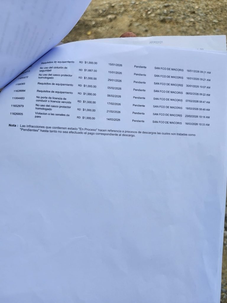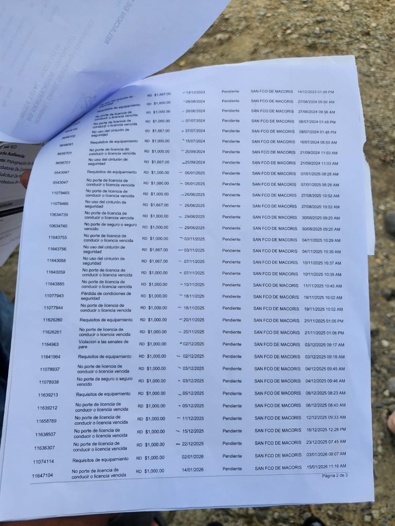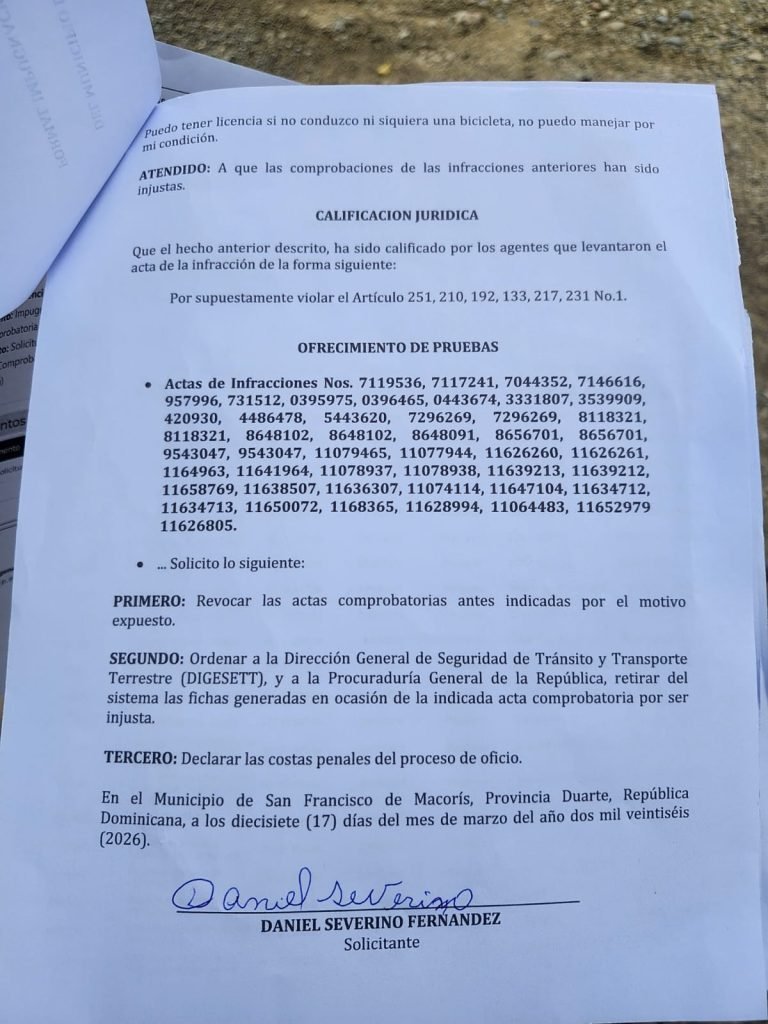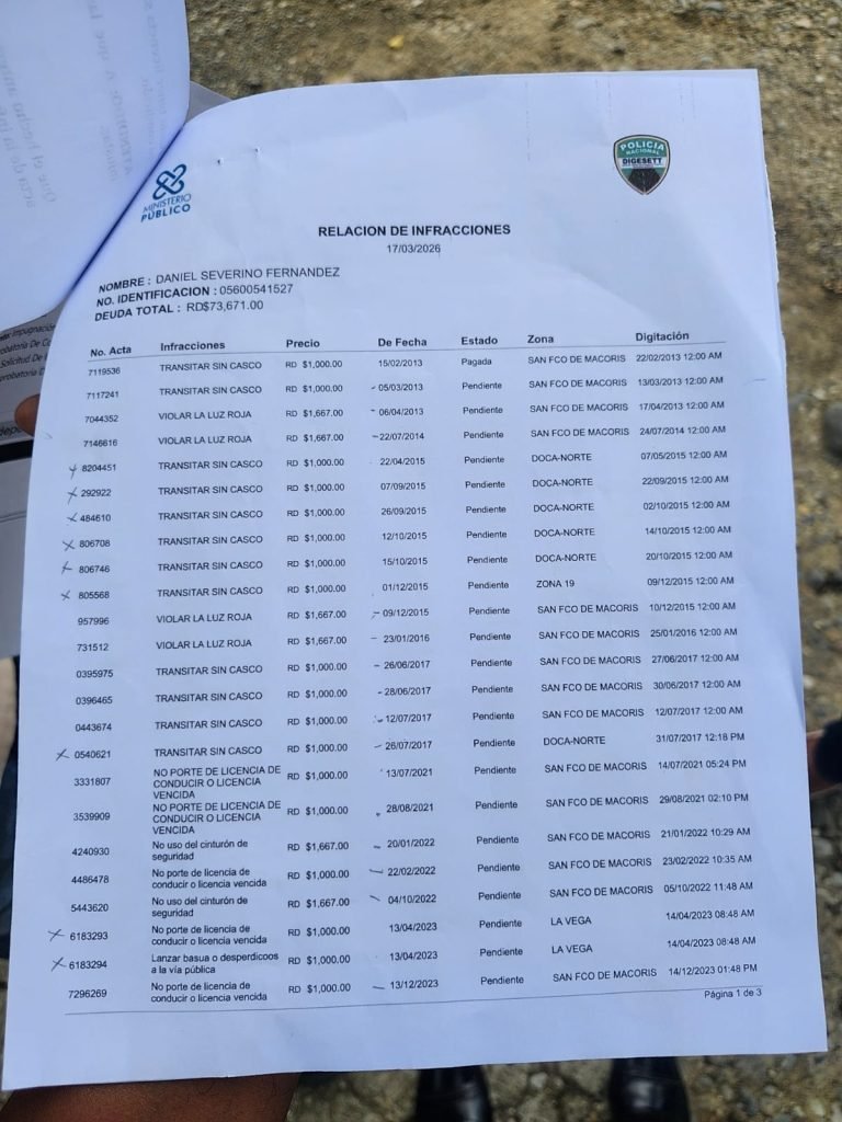 San Francisco de Macorís. – Un hombre identificado como Daniel Severino denunció que, a pesar de no poseer vehículo, figura con un total de 73 multas registradas a su nombre por parte de la DIGESETT.