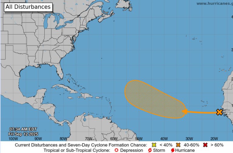 “Se vigila una onda tropical localizada cerca de la costa occidental de África que está produciendo aguaceros y tormentas eléctricas desorganizadas. Durante el fin de semana y a inicios de la próxima semana, las condiciones ambientales podrían favorecer un desarrollo gradual de este sistema. En las próximas 48 horas presenta una probabilidad muy baja de alcanzar la categoría de ciclón tropical, sin embargo, en los próximos 7 días, un 40 %”, dijo en su informe de este viernes.