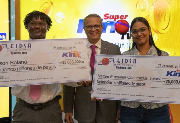 SANTO DOMINGO.- La Lotería Electrónica Internacional Dominicana, S.A. (Leidsa), informó que entregó dos cheques de 25 millones de pesos cada uno, a los ganadores del Super Kino TV, Ivettee Franyelin Concepción Tejada y Nelson Roland.