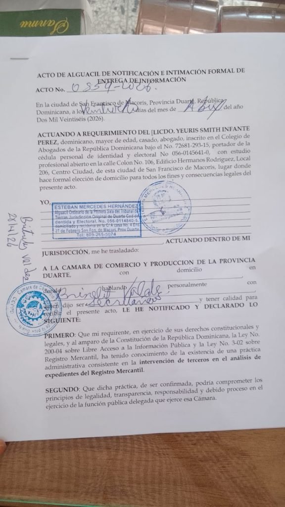 En San Francisco de Macorís fue depositado un acto de alguacil mediante el cual se notifica e intima formalmente a la Cámara de Comercio y Producción de la provincia Duarte a entregar información relacionada con el análisis de expedientes del Registro Mercantil.