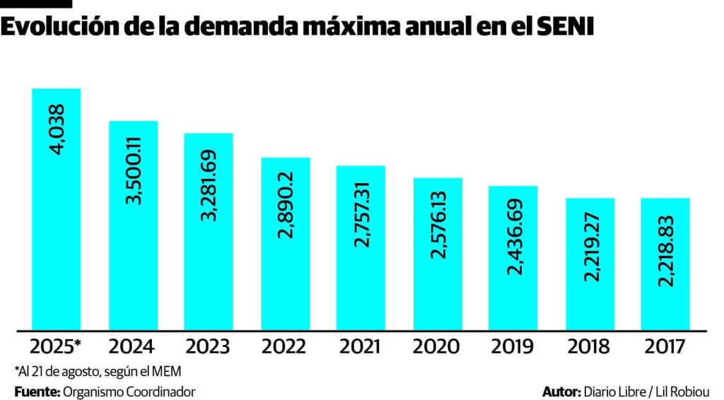 Entre 2023 y 2024, la economía dominicana aceleró el aumento de su demanda energética, con alzas de 391.49 MW y 218.42 megavatios, respectivamente, según datos del Organismo Coordinador del SENI.