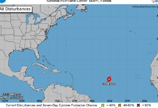 El Indomet informa que da seguimiento a la formó la tormenta tropical Lorenzo, localizada a unos 1,760 kilómetros de las islas de Cabo Verde, con vientos máximos de 75 kilómetros y se mueve hacia el noroeste. “Por suposición geográfica seguimos atentos a la evolución y desarrollo de este sistema”.