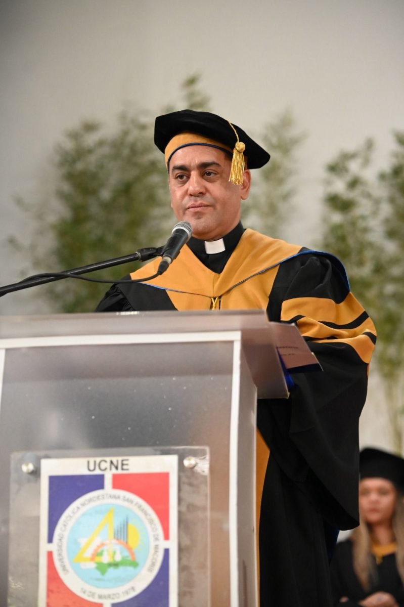 En la ceremonia, Monseñor doctor Ramón Alfredo de la Cruz Baldera, obispo de la Diócesis de San Francisco de Macorís y gran canciller de la UCNE, realizó la solemne invocación a Dios, mientras que las palabras de bienvenida fueron pronunciadas por el doctor Martin Ortega Then, vicerrector académico de la institución.